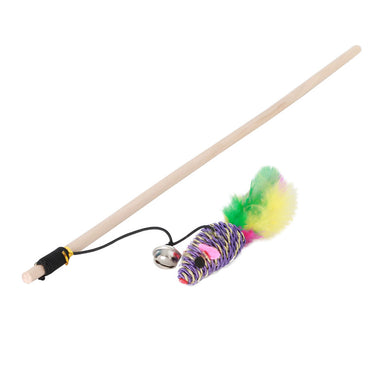 Katzen Spielzeug, Interaktive Katzenangel mit buntem Mausspielzeug und Federdekoration, stabilen Holzstab, Farbe zufällig, circa 40 cm Länge