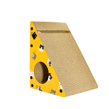 Kratzpappe Katze, Dreieckige Katzenkratzscheibe mit Loch, Spielzeug für Katzen mit Klingelball, Gelb