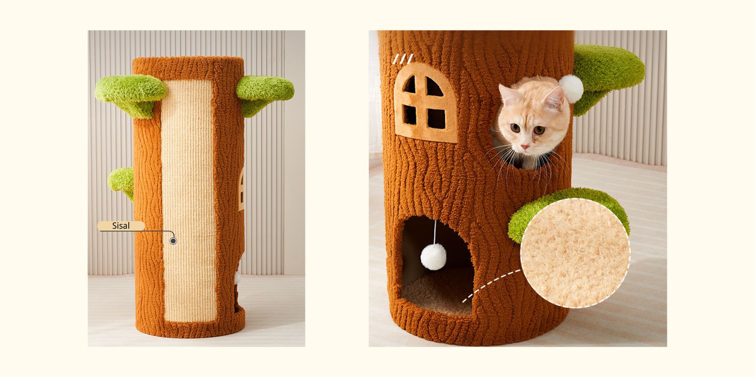 Kratzbrett Katze, Katzenbaum Mehrgeschossiger, Cartoon Baumstamm Design, für Unterhaltung und Krallenpflege, Hellbraun und Dunkelbraun