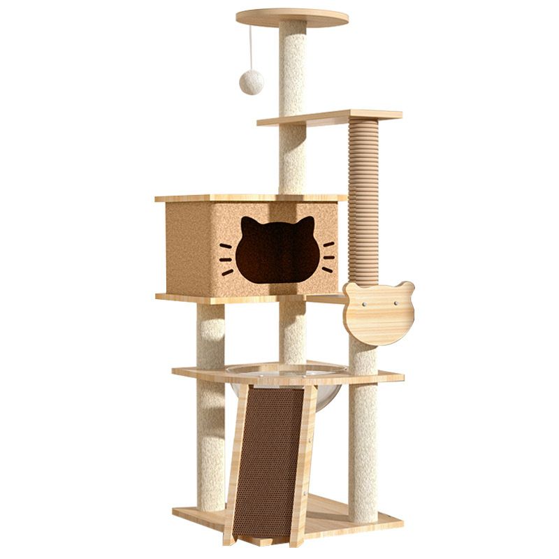 Katzenbäume, Katzenbaum aus Holz mit Raumkapsel und kratzbrett, Stabiler Katzenmöbel, 130cm, hellbraun