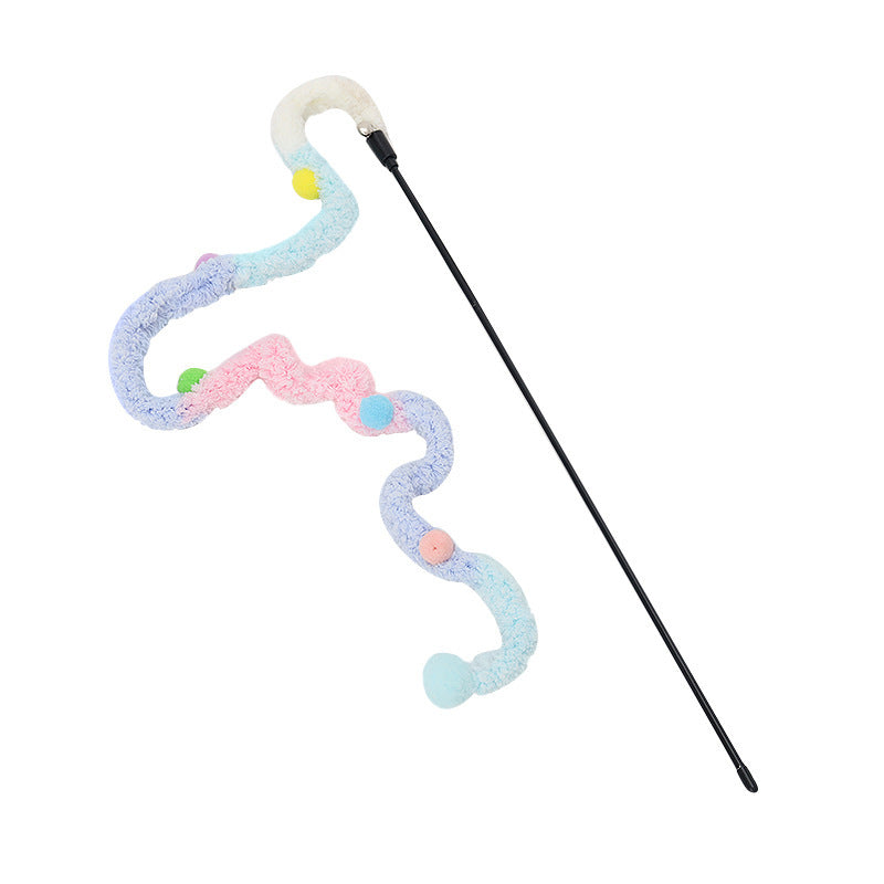 Katze Spielzeug, Raupen-Katzenangel mit Kleine Glocke, Langer Plüsch in Blau, Pink & Grün, 48 cm Holzgriff, Interaktives