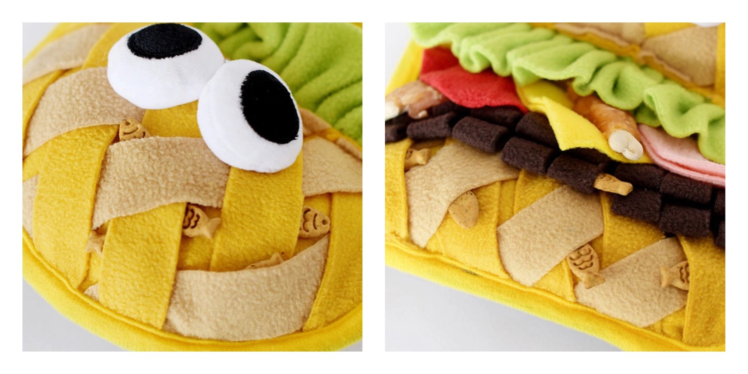 Das Hunde Intelligenzspielzeug bietet eine Vielzahl von Spielmöglichkeiten. Jeder Teil des Spielzeugs ist darauf ausgelegt, verschiedene Sinne Ihres Hundes anzusprechen. Ob schnüffeln, ziehen oder entdecken – Ihr Hund wird motiviert, aktiv zu werden und Neues auszuprobieren. Die vier verschiedenen Modelle – Hamburger, Pommes, Hotdog und Pizza – bieten abwechslungsreiche Möglichkeiten, die das Spielen spannend und herausfordernd gestalten. Jedes Modell bringt dabei seine eigenen Reize und Funktionen mit, die für stundenlangen Spaß sorgen. Das vielfältige Design fördert die Kreativität und die Problemlösungsfähigkeiten Ihres Hundes und sorgt dafür, dass er nie genug davon bekommt.