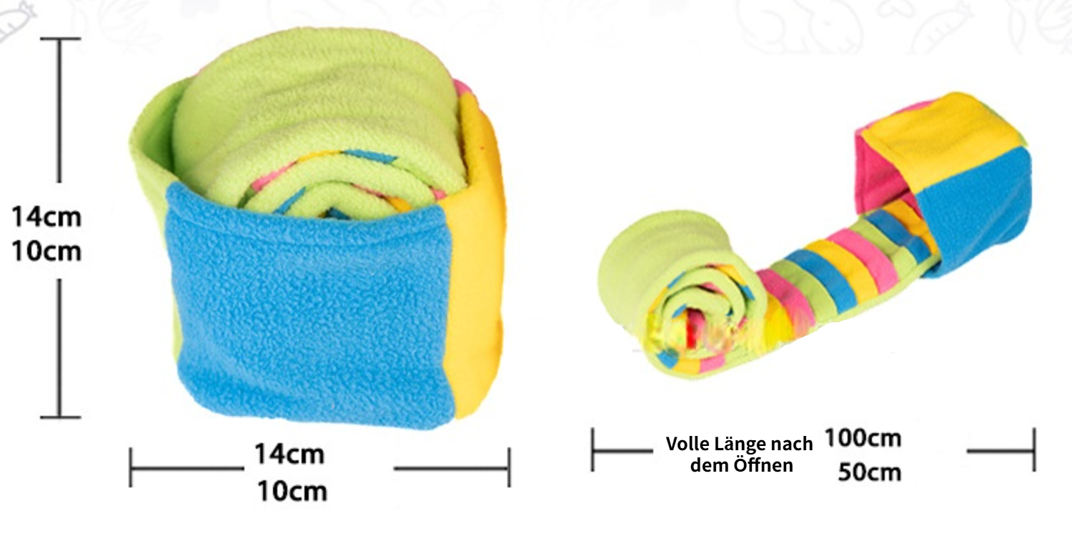 Das hunde intelligenzspielzeug ist in zwei verschiedenen Größen erhältlich: Klein (10 cm) und Groß (14 cm). Diese Größen sind perfekt auf die Bedürfnisse verschiedener Hunderassen abgestimmt. Wenn das Spielzeug ausgelegt wird, misst es bei der kleinen Variante 50 cm und bei der großen 100 cm in der Gesamtlänge. Diese Flexibilität sorgt dafür, dass jeder Hund – egal ob klein oder groß – in der Lage ist, mit diesem Spielzeug zu interagieren.