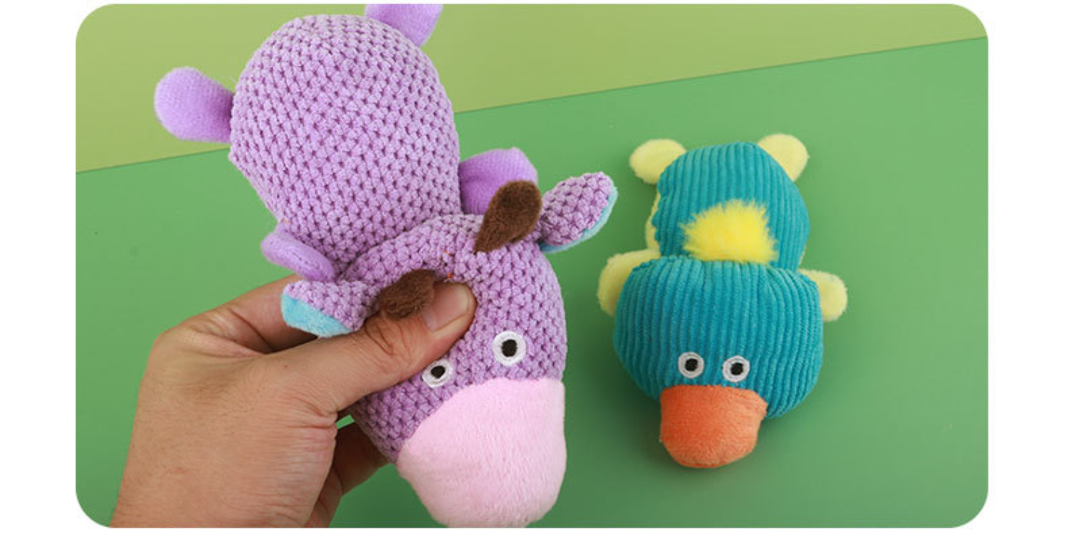 Unser kuscheltier für hunde ist der perfekte Begleiter für jede Hundestunde. Dieses speziell entwickelte Spielzeug bietet nicht nur immense Freude, sondern auch eine Vielzahl an Vorteilen für die Gesundheit und das Wohlbefinden Ihres Hundes. Mit unseren zwei verfügbaren Modellen, dem kuscheligen lila Rind und dem charmanten grünen Enten-Spielzeug, wird Ihr Hund sowohl Spaß als auch Komfort erleben. Jedes dieser Spielzeuge hat eine eingebaute Geräuschfunktion, die ein ansprechendes Quietschen erzeugt und zur Spielzeit anregt.