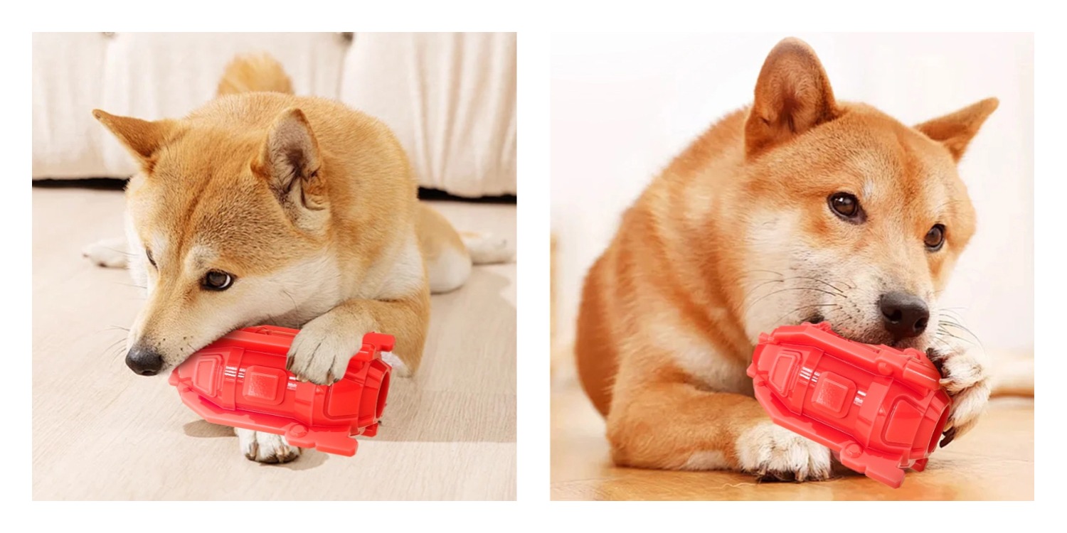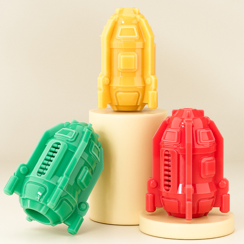 Das auffällige Design unseres Spielzeugs in Form einer Rakete sorgt für noch mehr Freude. Die besondere Form regt zum Spielen und Herumtollen an, während die weichen Kanten sanft zu den Zähnen Ihres Hundes sind. Egal, ob drinnen oder draußen – die Raketenform eignet sich hervorragend für alle Arten von Spielen, wie Apportieren oder Ziehen. Diese Abwechslung hilft Ihrem Hund, aktiv zu bleiben und seine Energie zu nutzen.