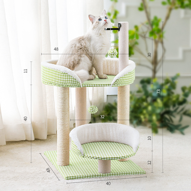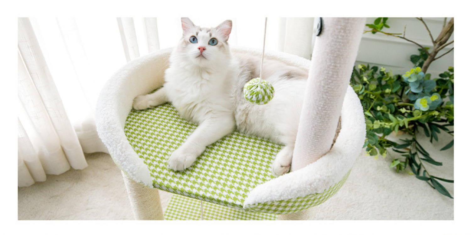 Dieser bezaubernde Katzenbaum in zartem Hellgrün ist der perfekte Ort für Ihre kleine oder mittelgroße Katze zum Spielen, Klettern und Entspannen. Umhüllt von einem weichen, karierten Stoff, bietet er nicht nur einen optischen Blickfang in Ihrem Zuhause, sondern auch ein kuscheliges Plätzchen für ein gemütliches Nickerchen.