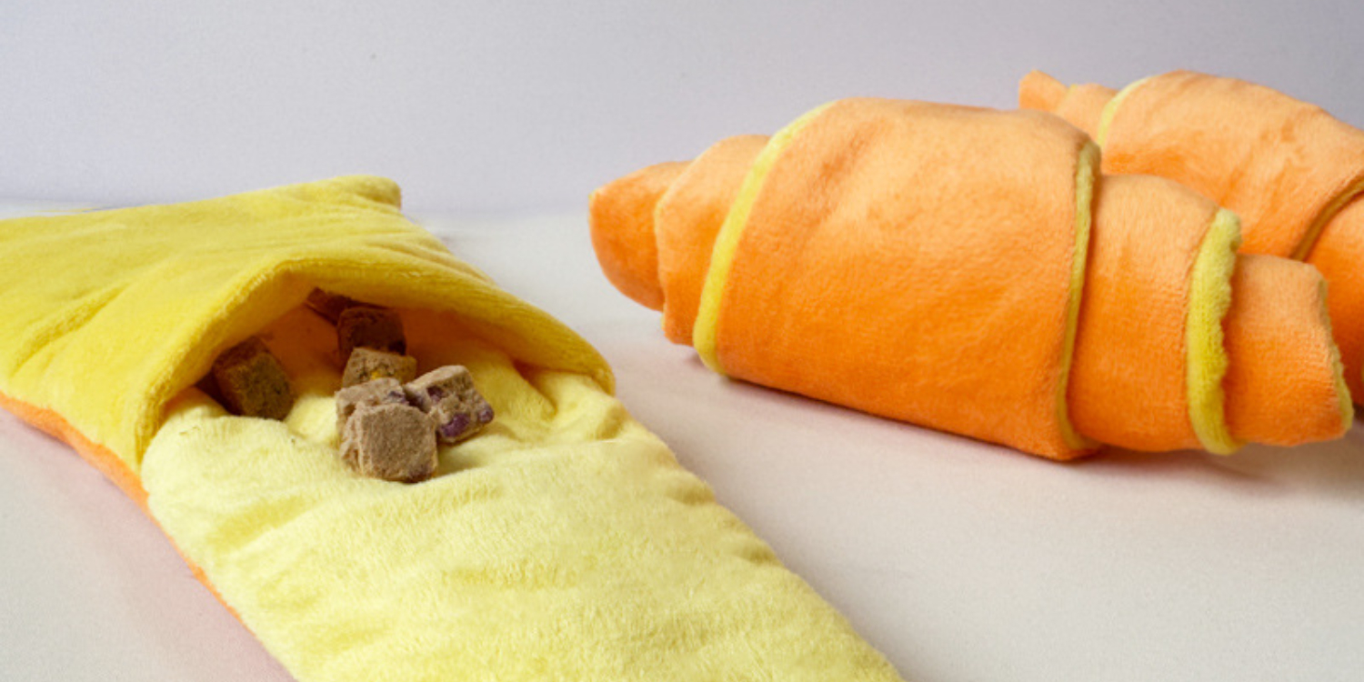 Das Croissant ist streich- und faltbar und öffnet sich zu einem gleichschenkligen Dreieck (17 cm lang und 47 cm hoch) aus Plüsch. Im Inneren befindet sich ein kleiner Beutel, in den Sie Katzenleckerlis (z. B. Trockenfutter oder Snacks) geben können. Um die Tüte zu öffnen, muss die Katze das Croissant flach hinlegen, was eine perfekte Übung für ihre Koordination und Intelligenz ist. Das Öffnen eines Croissants ist wie das Kauen auf echtem Brot, was den natürlichen Instinkt einer Katze auslöst.