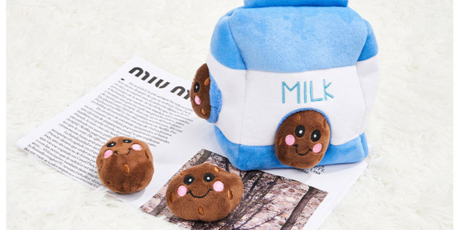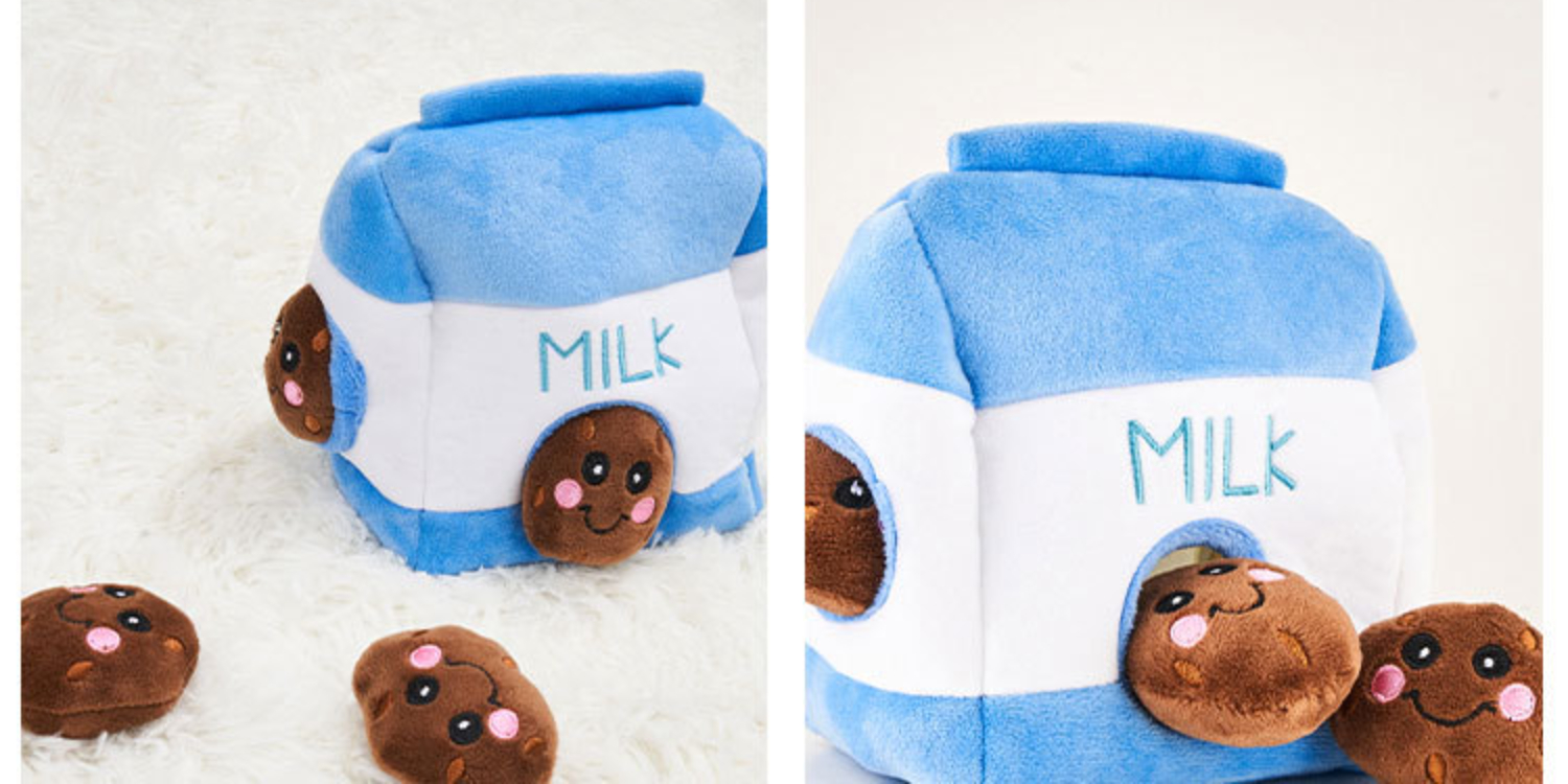 Milchkarton: Ein weißer Milchkarton mit einem kleinen Plüschtier in Form einer Kaffeebohne darin, das durch ein Loch in der Schachtel herausgenommen werden kann.