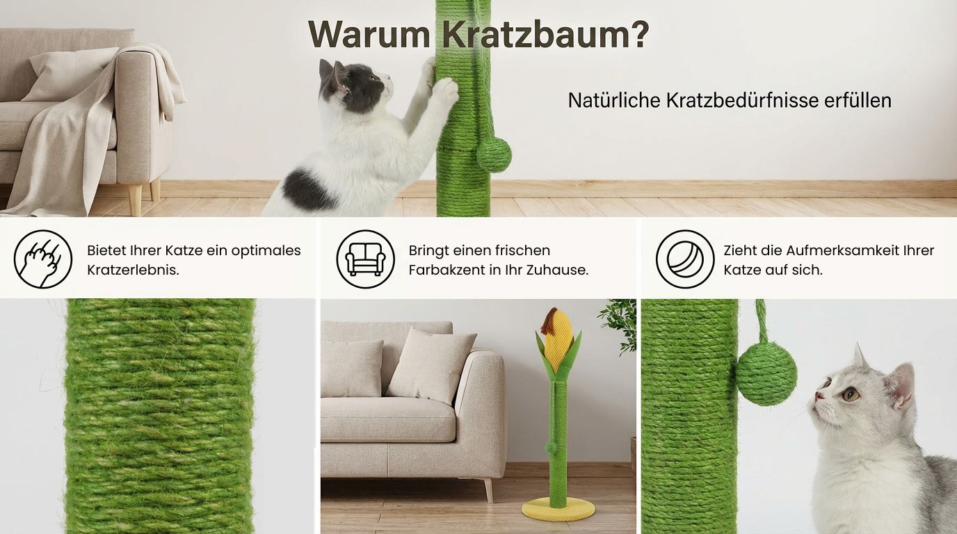 Der Kratzbaum imitiert das Design eines Maiskolbens und macht ihn zu einem echten Blickfang in Ihrem Zuhause.Das weiche und widerstandsfähige Sisalmaterial, das in der gesamten Kratzsäule verarbeitet wurde, sorgt dafür, dass Ihre Katze ihre Krallen ohne Beschädigung schärfen kann. Im Gegensatz zu herkömmlichen Kratzmöbeln, die häufig wenig optische Anziehungskraft haben, fügt sich der Kratzbaum Nature harmonisch in Ihre Wohnlandschaft ein und bietet Ihrer Katze gleichzeitig einen gesunden und unterhaltsamen Platz zum Kratzen.